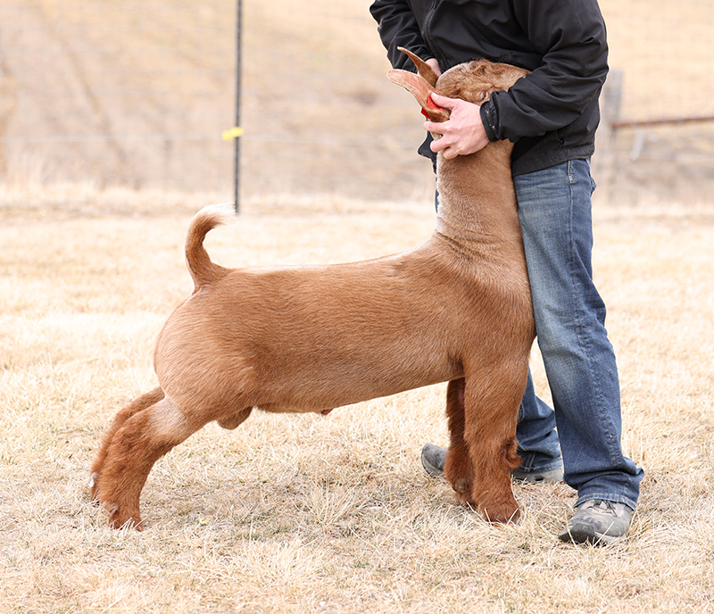 The most exciting red sire we have gotten to stud to date! Mile long neck, perfectly round cage, and massive hip and hind leg. His mom has consistently generated big muscled, bold bodied goats that feed extremely well. RED RUM is the wildest looking, biggest rumped, and fattest legged Ham Gravy son in our mix. Carson’s Snapchat video of him when we first got him clipped was extremely well recieved! We see RED RUM as a key piece in our quest to make the very best females in the game!